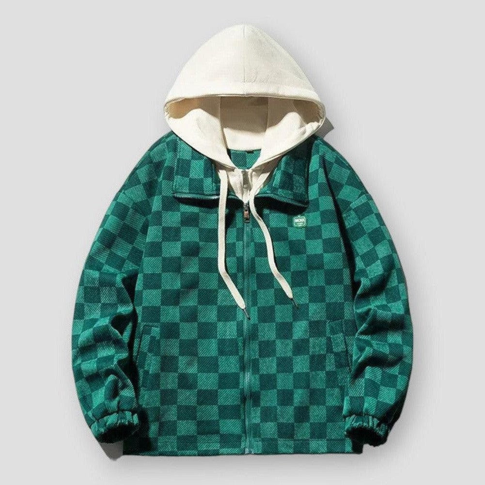 This ethereal piece will wrap you in warmth and comfort, inviting you to embrace your inner dreamer with its checkered y2k design and spliced hood. Feel the nostalgia and modern charm blend together in perfect harmony as you zip up this jacket and embark on a journey of style and emotion.